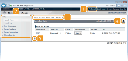 Viser [Status Monitor/Cancel]-siden. Du kan bruke denne siden til å kontrollere gjeldende utskriftsstatus, avbryte utskriftsbehandling og vise en historikk over utskriftsjobber.