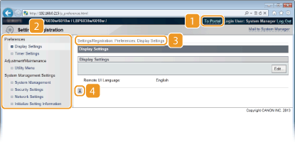 Viser siden [Settings/Registration]. Når du er logget på systemstyrermodus, kan du bruke denne siden til å endre maskininnstillinger.