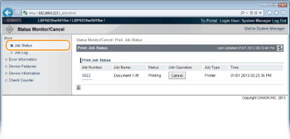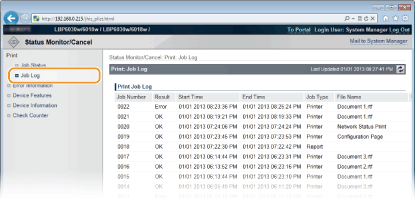 Klikk på [Job Number] for å vise detaljert informasjon om et dokument. For eksempel kan du kontrollere brukernavnet og antall utskrevne sider for dokumentet.