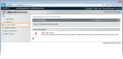 Når det oppstår en feil kan du vise denne siden ved å klikke på meldingen vist under [Error Information] på portalsiden (hovedside).