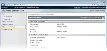 Denne siden viser informasjon om maskinen og systemstyreren. Denne informasjonen er angitt i [System Management] på siden [Settings/Registration] (