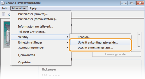 Du kan skrive ut innstillingslister fra skriverstatusvinduet. Dette er praktisk når du ønsker å skrive ut en liste for nettverksinnstillinger, eller en liste over strømsparing og andre konfigurasjonsinnstillinger for maskinen. Innstillingslistene er formatert for å skrive ut på papir med A4-format. Før de legges i, legg i papir med A4-format i flerfunksjonsskuffen.