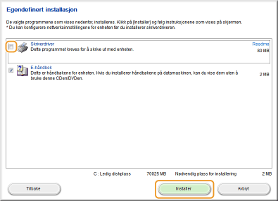 Fjern merket i boksen for [Skriverdriver] og klikk på [Installer].