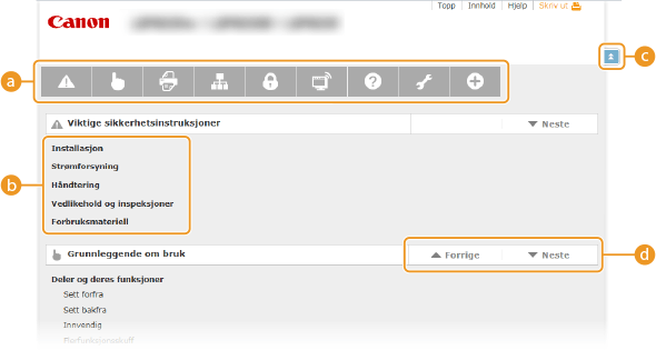 Elektronisk håndbok er delt inn i forskjellige skjermbilder, og innholdet på det enkelte skjermbilde varierer.