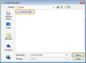 Określ folder, w którym zostały zapisane dodatkowe sterowniki i wybierz plik Inf, a następnie kliknij przycisk [Otwórz].