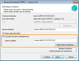 Jeśli używana drukarka jest połączona za pomocą kabla USB, nie można skonfigurować serwera wydruku w trakcie instalacji sterownika drukarki. Serwer wydruku należy skonfigurować po zainstalowaniu sterownika drukarki, korzystając z procedury opisanej powyżej.
