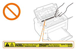 ). Może to spowodować uszkodzenie urządzenia.![]() Nie wolno WYŁĄCZAĆ urządzenia podczas drukowania. Ponadto, aby zapobiec zakleszczeniu papieru, w trakcie drukowania nie należy otwierać lub zamykać pokrywy ani ładować lub wyciągać papieru.