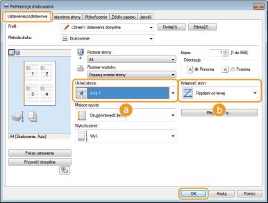 W sekcji [Układ strony] określ liczbę stron, która ma zostać wydrukowana na jednym arkuszu