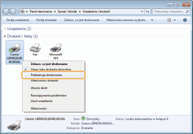 Kliknij prawym przyciskiem myszy ikonę urządzenia i wybierz polecenie [Preferencje drukowania].