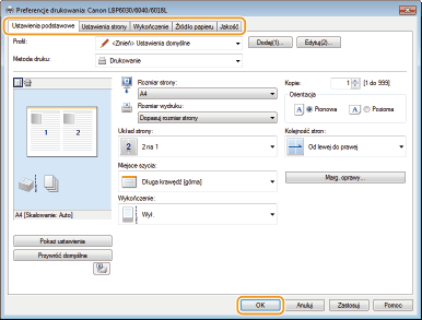 Kliknij kolejno karty [Ustawienia podstawowe], [Ustawienia strony], [Wykończenie], [Źródło papieru] i [Jakość], aby na każdym z ekranów skonfigurować wymagane ustawienia wydruku .
