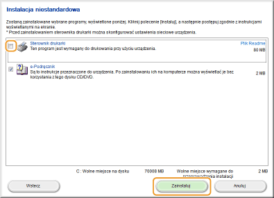 Usuń zaznaczenie pola wyboru [Sterownik drukarki], a następnie kliknij przycisk [Zainstaluj].