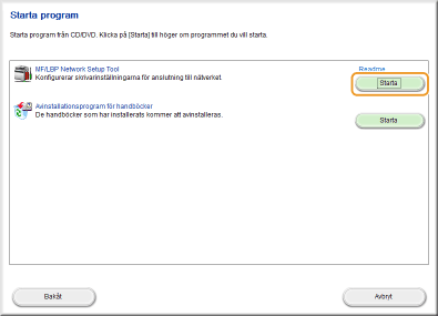 MF/LBP Network Setup Tool är ett verktyg som du kan använda för att konfigurera initiala nätverksinställningar genom att följa anvisningarna på skärmen. Verktyget startar automatiskt när du installerar en skrivardrivrutin från cd/dvd-skivan med användarprogram. Om du vill starta det manuellt gör du det från cd/dvd-skivan med användarprogram eller direkt från en fil som du laddar ned från Canons webbplats.