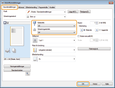 Välj pappersformat i [Utmatningsstorlek]