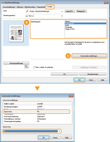 Välj [Spara toner] på skärmen [Avancerade inställningar]