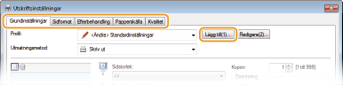 Ändra utskriftsinställningarna efter behov på flikarna [Grundinställningar], [Sidformat], [Efterbehandling], [Papperskälla] och [Kvalitet].