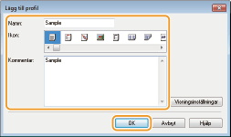 Ange ett profilnamn i [Namn], välj en ikon och klicka sedan på [OK].