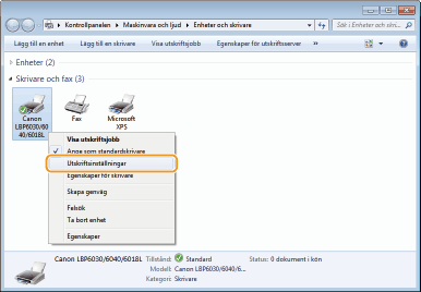 Högerklicka på ikonen för enheten och klicka sedan på [Utskriftsinställningar].