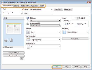 Ändra utskriftsinställningarna efter behov på flikarna [Grundinställningar], [Sidformat], [Efterbehandling], [Papperskälla] och [Kvalitet].
