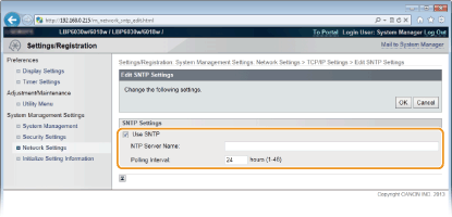Med Simple Network Time Protocol (SNTP) kan du ställa in systemklockan genom att använda en tidsserver på nätverket. Om du använder SNTP kontrollerar systemet tidsservern med jämna mellanrum och systemklockan går alltid rätt. Tiden baseras på UTC (Coordinated Universal Time) och du behöver därför välja tidszon innan du konfigurerar SNTP ( Timer Settings).