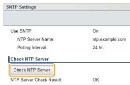 Du kan testa om enheten kommunicerar med den registrerade tidsservern via SNTP. Klicka på [Settings/Registration]  [Network Settings]  [TCP/IP Settings] för att visa [SNTP Settings] och sedan på [Check NTP Server]. Om en korrekt anslutning har upprättats visas resultatet enligt nedan. (Observera att den här åtgärden enbart kontrollerar anslutningen och inte justerar systemklockan.)
