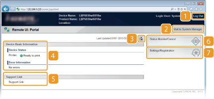 Visar [Settings/Registration]-sidan. Om du är inloggad i systemhanteringsläge kan du ändra enhetens inställningar på den här sidan.