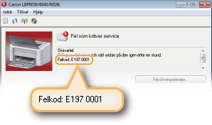 Ett felmeddelande visas i skrivarstatusfönstret om det blir fel vid utskriftsbearbetningen, om enheten inte kan kommunicera eller om något annat fel förhindrar normal drift. Mer information om felmeddelanden finns i listan nedan.