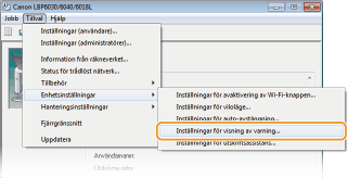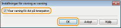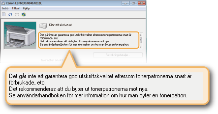 Du kan ange att ett meddelande, liknande nedanstående, ska visas då utskriftskvaliteten inte kan säkerställas på grund av att tonerpatronen börjar ta slut eller av annan orsak. På detta sätt slipper du få utskrifter av dålig kvalitet och får en förvarning innan det är dags att byta tonerpatron.