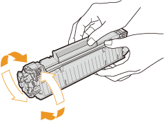 Skaka tonerpatronen 5 eller 6 gånger enligt nedan för att fördela tonern jämnt i patronen.