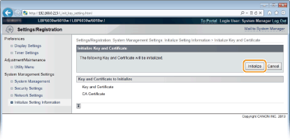 Du kan återställa inställningarna för nyckelpar (inställningar för nycklar och certifikat) och CA-certifikat till fabriksinställningarna. Observera att alla nyckelpar som du har registrerat i enheten och alla CA-certifikat (utom förinstallerade CA-certifikat) tas bort med en initiering.
