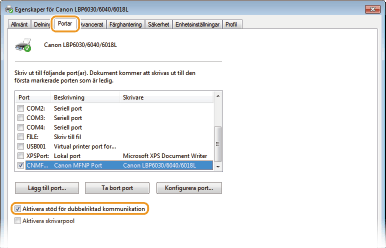 Under fliken [Portar] kontrollerar du om kryssrutan [Aktivera stöd för dubbelriktad kommunikation] är markerad.
