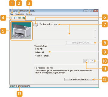 Yazıcı Durumu Penceresi, makinenin durumunu incelemenizi, hata bilgilerini görmenizi ve makineyle ilgili ayarları (örneğin güç tasarrufu ayarları) yapmanızı sağlayan bir hizmet programıdır. Programı, bir yazdırma işini iptal etme veya makine ayarlarının listesini yazdırma gibi işlemler için kullanabilirsiniz. Bilgisayarınıza yazıcı sürücüsünü yüklediğiniz zaman, Yazıcı Durumu Penceresi hizmet programı da otomatik olarak yüklenir (