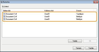 En fazla 5 belgenin gösterildiği bir listede, yazdırılmakta olan ve yazdırılmayı bekleyen belgeler görülür.