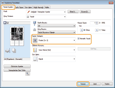 [Sayfa Yerleşimi]'nde, yazdırılacak bölümlerin sayısını belirterek bir poster boyutu seçin; örneğin [Poster [3 x 3]]