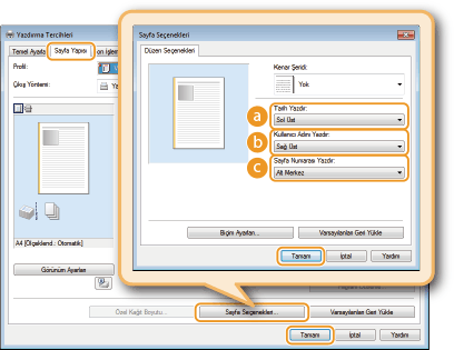 Tarih, kullanıcı adı ve sayfa numarasının yazdırılacağı yeri seçin