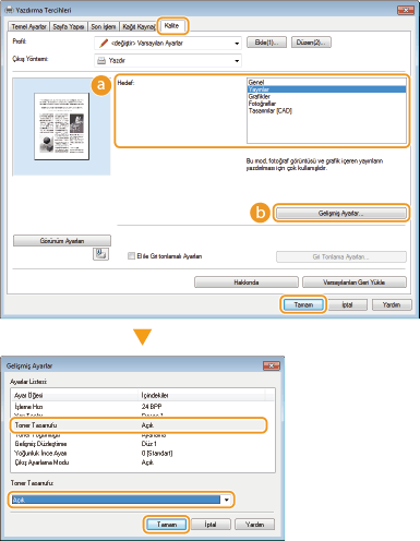 [Gelişmiş Ayarlar] ekranında, [Toner Tasarrufu] ayarlarından başka çeşitli yazdırma ayarları belirtebilirsiniz. Ayarlar hakkında daha fazla bilgi için, yazıcı sürücüsü ekranında [Yardım] düğmesine tıklayın.