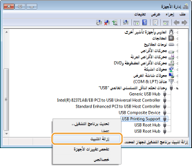 انقر بزر الماوس الأيمن فوق [USB Printing Support], ثم انقر فوق [إلغاء التثبيت].