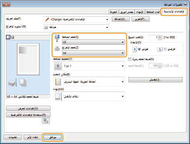 يمكنك تكبير المطبوعات أو تصغيرها باستخدام نسبة طباعة محددة مسبقًا، مثل A5 إلى A4, أو نسبة طباعة مخصصة قمت بتعيينها في الزيادات المتدرجة بنسبة 1%.