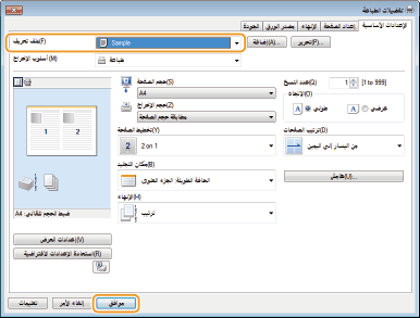 قم بإعدادات الطباعة كما هو مطلوب في علامات تبويب [الإعدادات الأساسية]، [إعداد الصفحة]، [الإنهاء]، [مصدر الورق] و [الجودة].