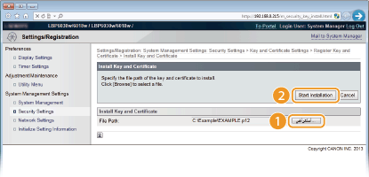 انقر فوق [Key and Certificate Settings] لتثبيت زوج المفاتيح، أو [CA Certificate Settings] لتثبيت شهادة المرجع المصدق CA.