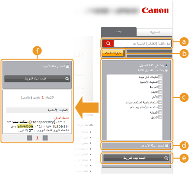 انقر لتبديل العرض بين علامة تبويب [المحتويات] وعلامة تبويب [بحث].