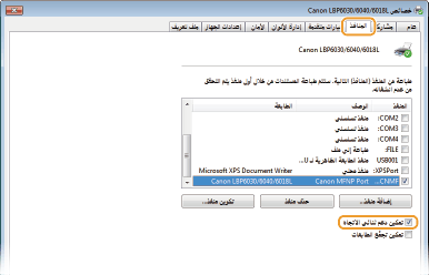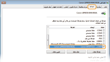 إذا كان [الوصف] الخاص بالمنفذ المحدد هو [Canon MFNP Port]، وكان الجهاز وجهاز الكمبيوتر على الشبكة الفرعية نفسها، سيتم الحفاظ على الاتصال. لا تحتاج لإضافة منفذ جديد. إذا كان المنفذ هو [Standard TCP/IP Port]، تحتاج إلى إضافة منفذ جديد. تكوين منافذ الطابعة