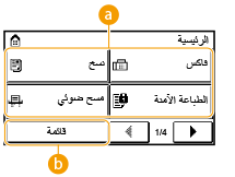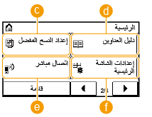 تظهر الشاشة <الرئيسية> لبدء تشغيل العمليات وشاشات تحديد الإعدادات على شاشة العرض. كما يمكنك عرض تقدم المهام والرسائل هنا. المسْ شاشة العرض لتشغيلها.
