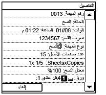 يعرض الحالة الحالية للعنصر المحدد. وتظهر شاشة <حالة مهمة النسخ/الطباعة> فيما يلي كمثال.