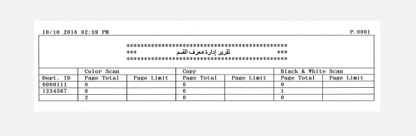 عندما يتم تمكين إدارة معرف القسم، يمكنك طباعة تقرير للتحقق من الرقم الإجمالي للصفحات التي تم نسخها وطباعتها ومسحها ضوئيًا لكل معرف قسم. يُمَكنك التقرير من مراقبة الاستخدام وتحسين الإدارة.