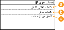 ![]() ![]() إذا كنت لا ترغب في استخدام DHCP/BOOTP/RARP لتعيين عنوان IP فحدد <إيقاف>. إذا قمت بتحديد <DHCP> أو <BOOTP> أو <RARP> عندما تكون هذه الخدمات غير متاحة، فسيقوم الجهاز بإضاعة الوقت وموارد الاتصالات بحثًا في الشبكة للوصول إلى هذه الخدمات. |
