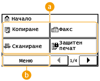 На дисплея се показва екранът <Начало> за инициализиране на операции и екрани за задаване на настройки. Тук можете също да преглеждате прогреса на изпълнение на задачите и съобщенията. Докоснете дисплея, за да работите с него.