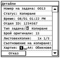 Показва текущия статус на избрания елемент. Екранът <Статус на зад. за коп./отпеч.> е показан по-долу като пример.