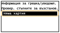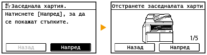 В някои случаи, когато възникне грешка, се извеждат инструкции как да се реагира при тази грешка. Следвайте инструкциите на екрана, за да отстраните проблема. Екранът, който се извежда при засядане на хартия, е показан по-долу (