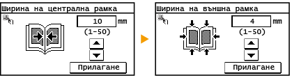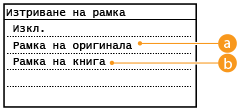 При копиране на документи, които са по-малки от изходния формат на хартията, може да се появят рамки около ръбовете на документа в копието. При копиране на срещулежащи страници на дебела книга, може да се появят тъмни сенки. <Изтриване на рамка> ви дава възможност да изтриете тези рамки и сенки.
