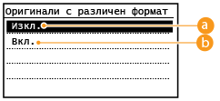 <Оригинали с различен формат> не е достъпно, когато се използва <2 в 1>/<4 в 1>, <Копиране на ID карта>, <Изтриване на рамка> или <Книга->2 страници>.